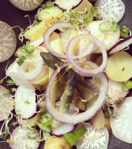 Salade de pommes de terre tièdes, pointes d’asperges et radis arc en ciel