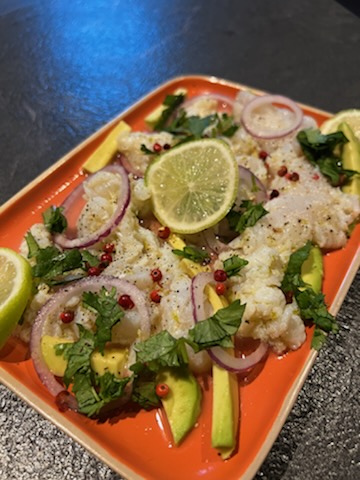 Sur un plat, disposer le poisson avec la marinade, les rondelles d’oignon et de citron, l’avocat en lamelles et les baies roses. Parsemer de coriandre hachée. Remettre un tour de moulin de sel et poivre, et garder au frais en attendant de servir.