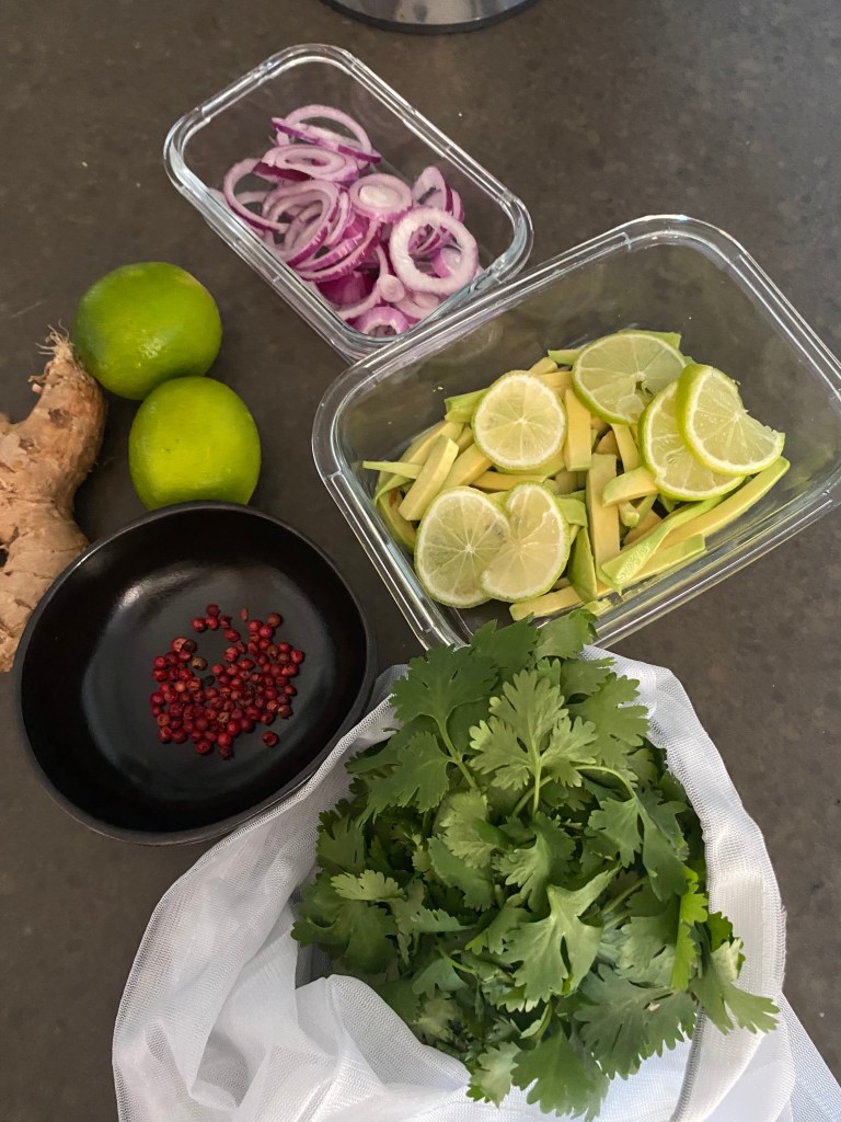 Pendant ce temps, tailler l’oignon rouge en rondelles fines, émincer l’avocat, couper le citron restant en rondelles, et hacher la coriandre.