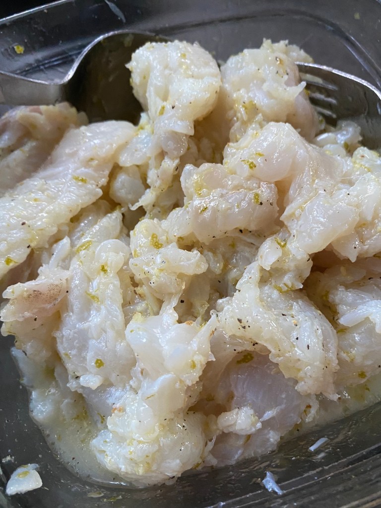 Emincer le cabillaud en morceaux pas trop épais. Le mettre dans un saladier avec les zestes et jus de 3 citrons, le gingembre râpé, l’huile d’olive, saler et poivrer et laisser mariner 1 heure au réfrigérateur.